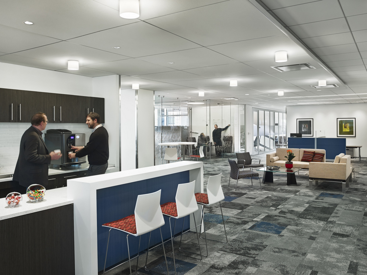 無獨有偶,北美最大的人體工程學(xué)顧問公司Humantec也對辦公室進行了一番改造??偛谜材匪?谷德(James Good)在征求員工意見之后,花費數(shù)月時間將辦公空間打造成了融會議、協(xié)作辦公、餐飲小憩等多功能的WorkCafe。其中,不僅有像不倒翁一樣搖擺的Buoy坐凳,專門為平板智能終端使用者量身定制的Gesture座椅,還有五個半封閉的圍合沙發(fā)供員工靜心閱讀和休息。另外,八成以上的辦公空間沒有被指定某種具體用途,所有的員工都可以隨時擺弄里面的多媒體設(shè)備,調(diào)節(jié)座椅和餐桌的高度,做任何在公共場所能做的事情……