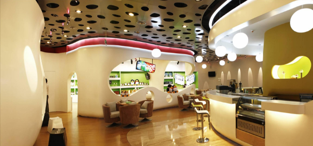 除了前臺和工作區(qū),我們還會看到怎樣的辦公家具呢?下面我們看到的就是騰訊的休閑娛樂區(qū),勞逸結(jié)合,才能更好地提高工作效率。這里四處充滿了各種曲線,再加上黃白色調(diào),讓人感到年輕時(shí)尚和溫馨舒適,是員工工作后休閑娛樂的不二之選。