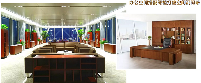 辦公家具的厚重質(zhì)感帶來恢弘大氣的視覺享受,與此同時,簡單亮麗的綠植點綴其間,平衡了會議、辦公區(qū)間的嚴肅氣氛,讓辦公區(qū)間中有了“呼吸感”。